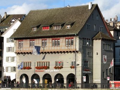 La sociedad Zur Constaffel, fundada en 1336, se reúne aquí para preservar tradiciones artesanales medievales que moldearon la identidad de Zúrich. Estas costumbres gremiales permanecen visibles en los salones formales y su uso continuo para asambleas cívicas.