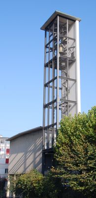La torre de campanas se abre a vistas desde tres lados y alberga cinco campanas fundidas por la fundición H. Rüetschi. La campana más grande emite un sonido distintivo en la vecindad cuando suena durante servicios y ocasiones especiales.