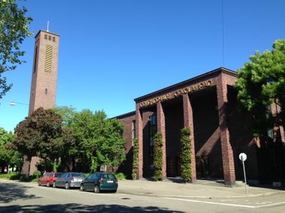 La Iglesia Oekolampad presenta una construcción de ladrillo rojo con una alta torre rectangular y grandes ventanas arqueadas en su fachada.