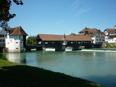 Covered wooden bridge over the river Reuss, Puente patrimonial clase B en Bremgarten, Suiza