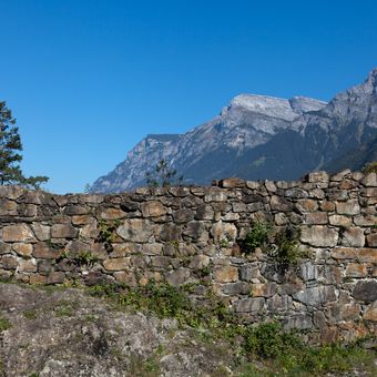 Los restos de piedra de Zwing Uri se alzan sobre una colina en el valle de Reuss, mostrando los cimientos de una torre defensiva y muros parciales.