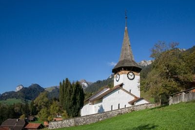 Reformed church with rectory, church buildings in Oberwil im Simmental in the canton of Bern, Switzerland