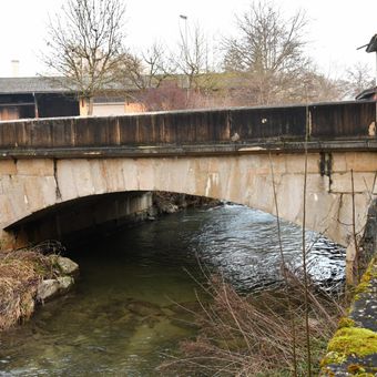 Stone arch bridge over the Lyssbach, stone bridge crossing the Lyssbach in Lyss in the canton of Bern, Switzerland