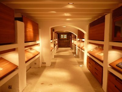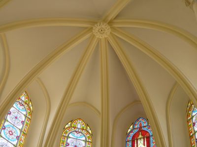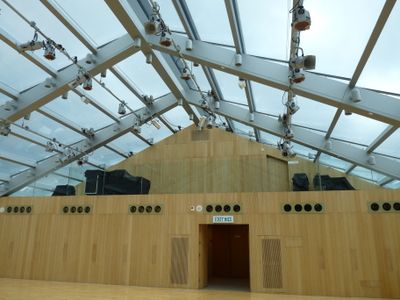 La estructura de estilo gótico incluye dos antiguos establos transformados en espacios escénicos, con bóvedas de crucería y vidrieras en todo el edificio.