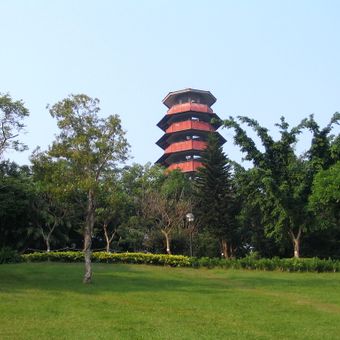El parque se extiende sobre aproximadamente 7,5 hectáreas y presenta una pagoda de siete niveles con un aviario, campos de fútbol y varias plazas conectadas por senderos peatonales a través de zonas ajardinadas. El diseño combina diferentes instalaciones de ocio para permitir varias actividades en un solo lugar.