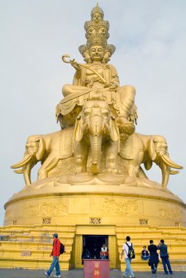 La estatua del Bodhisattva Samantabhadra de las Diez Direcciones se alza 48 metros de altura, mostrando una figura con diez cabezas sentada sobre un elefante de cuatro cabezas con seis colmillos. La estructura domina la zona cumbre del Monte Emei con su tamaño impresionante y detalles escultóricos intrincados.