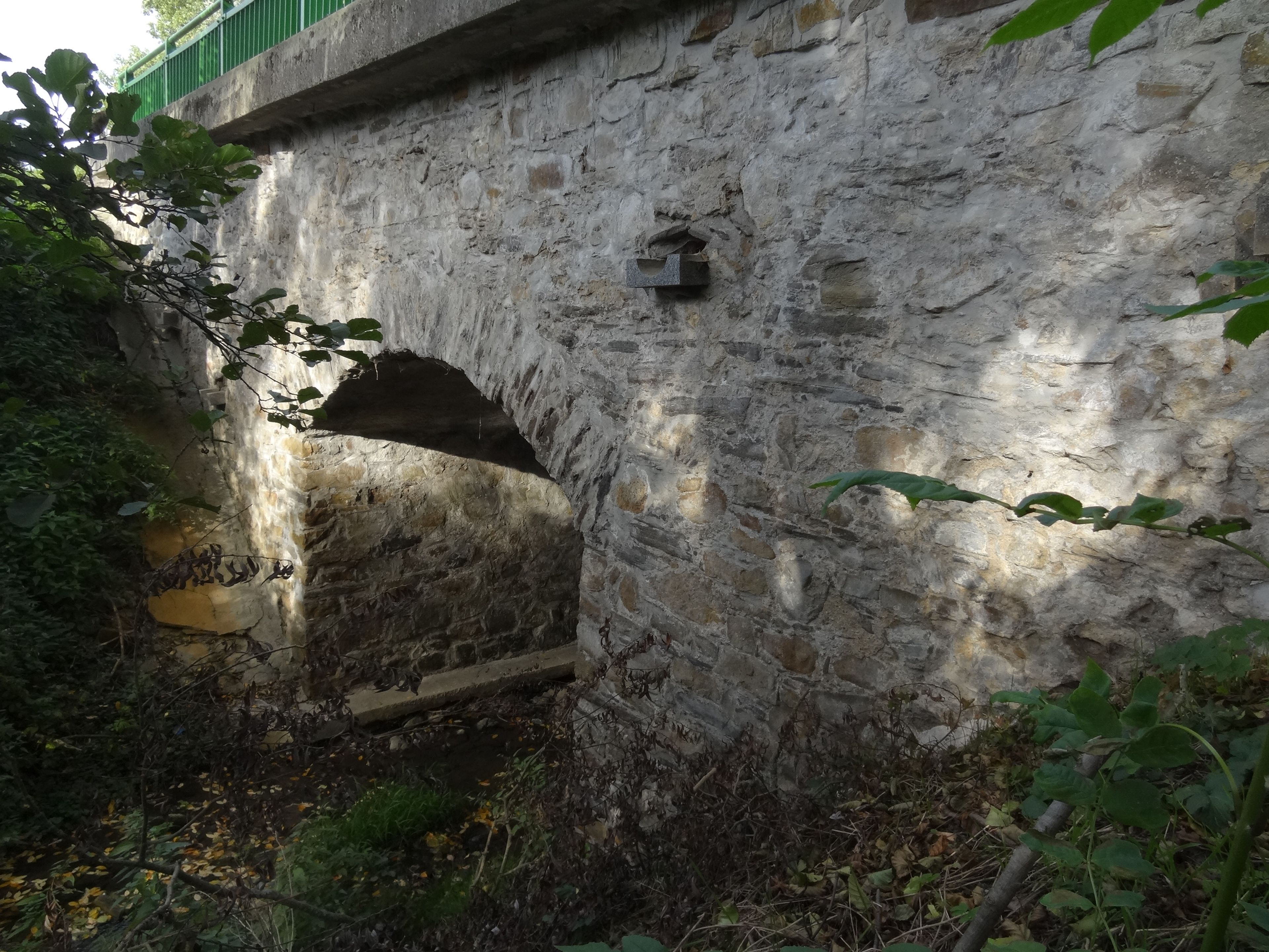 Most Dobřejovické ulice přes Luční potok, kamenný jednoobloukový most silnice II/146 v Hluboké nad Vltavou