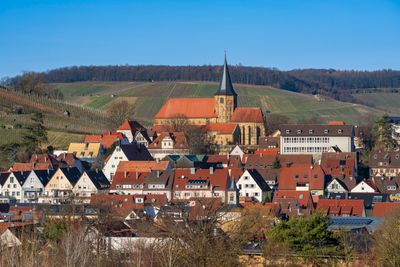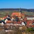 La ciudad se encuentra a 219 metros de altitud, con las ruinas del castillo Weibertreu visibles en una colina sobre edificios tradicionales alemanes.