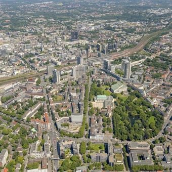 Essen es una gran ciudad en la zona del Ruhr en Renania del Norte-Westfalia, Alemania, que se extiende sobre un paisaje ondulado con zonas boscosas al sur y barrios más densos al norte. Las calles atraviesan antiguos sitios industriales, distritos residenciales con edificios de ladrillo y centros de negocios modernos concentrados alrededor de la estación central y la Kettwiger Straße.