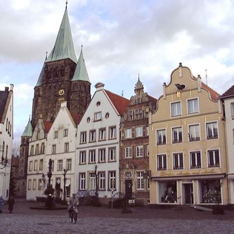 La ciudad se extiende junto al río Ems, exhibiendo arquitectura medieval con edificios de entramado de madera alrededor del mercado central.