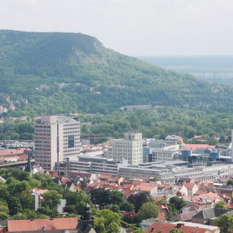 Jena es una ciudad universitaria de Turingia que se extiende a lo largo del valle del Saale entre colinas boscosas y acantilados de piedra caliza. El casco antiguo se asienta en la orilla occidental del río, mientras que las zonas residenciales más nuevas y las instalaciones de investigación trepan por las suaves laderas a ambos lados del valle.