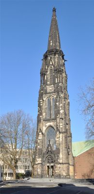 El edificio neogótico original de 1879 fue destruido durante un bombardeo en 1943, conservando solo la torre que contenía una capilla memorial.