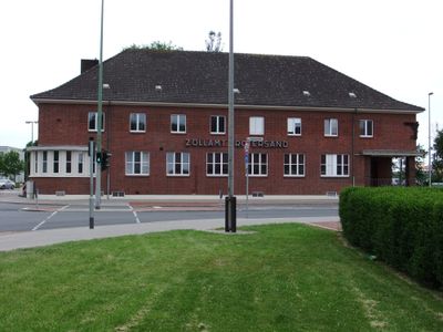 El Zollamt Rotersand se encuentra en Franziusstraße 1, construido en ladrillo rojo de dos pisos con ventana circular en esquina y ventanas horizontales.