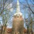 La torre de 56 metros con aguja cubierta de cobre define esta iglesia, que presenta una amplia nave central y bóvedas suspendidas.