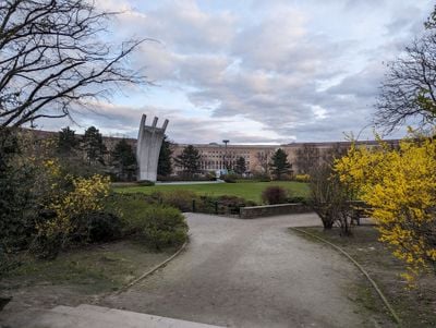 La plaza presenta un monumento central con tres arcos curvos que representan los corredores aéreos utilizados durante el puente aéreo de Berlín.