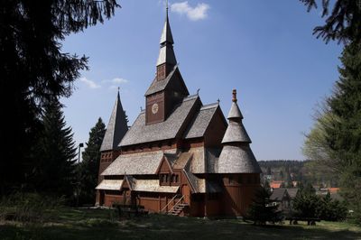 La iglesia Gustav Adolf es un templo de madera luterana en Hahnenklee con varios techos superpuestos que suben como escalones y adornos de cabezas de dragón. Las paredes exteriores tienen tablones de madera verticales colocados muy juntos, lo que crea una silueta singular.