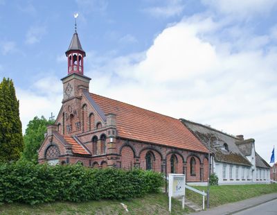La Iglesia de St. Theresia es un templo en Nordstrand con muros de ladrillo en estilo renacentista holandés y fachadas laterales articuladas rematadas por un tejado a dos aguas curvado con torre. La estructura muestra características arquitectónicas holandesas distintivas con fachadas cuidadosamente proporcionadas y detalles decorativos.