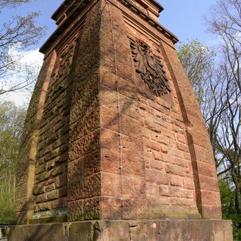 La estructura muestra un relieve del Águila Imperial realizado por Anton Viesel y el escudo de la familia Bismarck en su pared hacia la ciudad.