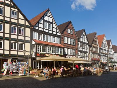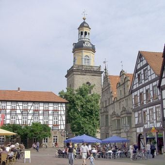 La ciudad se extiende junto al río Weser entre las colinas de Weserbergland y North Lippe Bergland, con numerosos edificios de entramado de madera.