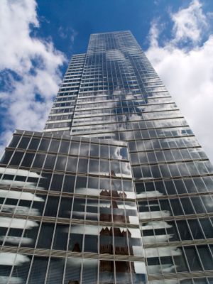La Torre de Colonia se eleva a 148.5 metros con 43 pisos, presentando una fachada de vidrio que refleja la luz en el distrito MediaPark.