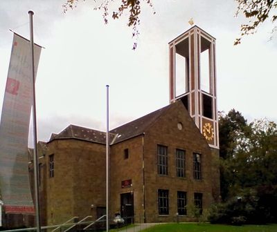 La Auferstehungskirche presenta una arquitectura moderna con líneas definidas, ventanales amplios y una torre campanario que destaca en el perfil urbano.