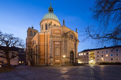 La Basílica de San Clemente presenta una cúpula central y dos torres laterales que reflejan la grandeza de la arquitectura barroca del norte de Alemania.
