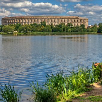 El Palacio de Congresos inacabado constituye la mayor estructura monumental nacionalsocialista conservada, con fachadas curvas de bloques de granito.