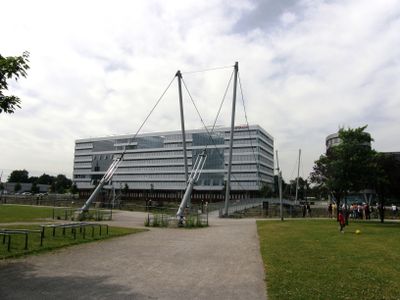 El Buckelbrücke se extiende 79 metros sobre el Puerto Interior, conectando el Jardín del Recuerdo con el paseo marítimo norte y Marina Duisburg.