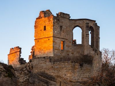 Los restos de piedra del Castillo Altenstein se elevan a 452 metros sobre el nivel del mar, con vistas a las colinas Haßberge y el valle Weisachtal.