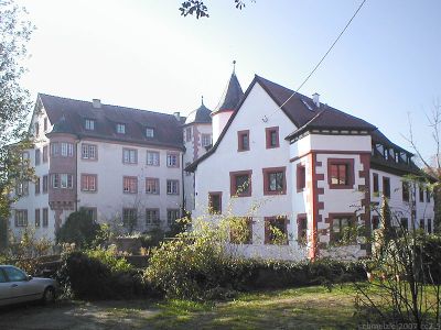 El Burg Lohrbach es un castillo acuatico cerca de Mosbach con cimientos rectangulares y canales de agua que lo rodean. La estructura consta de cuatro edificios residenciales conectados con una torre puerta prominente en el centro.