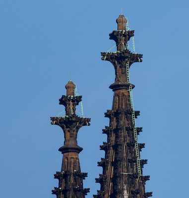 Los pináculos representan la última fase del desarrollo arquitectónico gótico en la Catedral de Colonia, incorporando refuerzos de cobre y mostrando pátina verde.