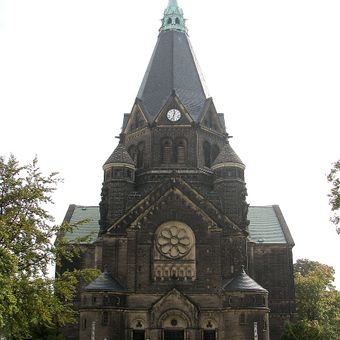 La Trinitatiskirche presenta una torre de 75 metros de altura y sigue la arquitectura neorrománica con planta en forma de cruz y elementos decorativos de piedra caliza.