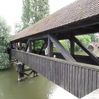 El Henkersteg es un puente peatonal medieval de madera sobre el rio Pegnitz con un pasaje cubierto y construccion tradicional de marco de madera. Conecta ambos lados de la ciudad vieja de Nuremberg y muestra tecnicas arquitectonicas tipicas de la epoca.