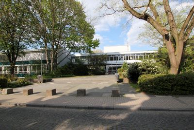 El Gimnasio Hildegard of Bingen presenta una estructura educativa alemana tradicional con diversos edificios distribuidos alrededor de un patio central.