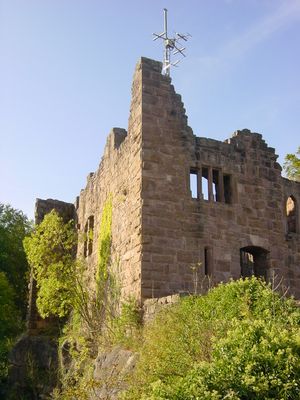 Las ruinas de Hohenschramberg se alzan sobre un espolón sureste de 636 metros de altura, con gruesos muros defensivos y múltiples puestos de artillería.