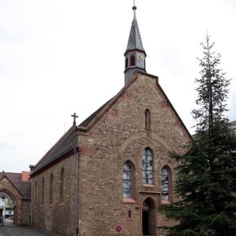La Hospitalkirche St. Joseph presenta una nave rectangular con coro empotrado, ventanas de arco apuntado y un campanario octagonal con aguja de tejas.