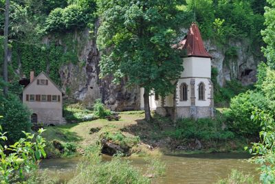 St. Wendel zum Stein es una capilla construida en un acantilado de toba de unos 30 metros de altura sobre el río Jagst. La estructura tiene tres paredes de piedra mientras que la cuarta es la roca natural que forma el acantilado.