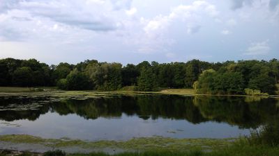 El complejo recreativo incluye un lago formado en una antigua cantera de grava, rodeado de espacios verdes con senderos y zonas de juego.