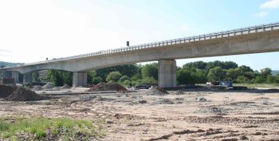 El puente Mainbrücke Randersacker se extiende 540 metros sobre el río Main, con dos calzadas sostenidas por pilares de hormigón y elementos estructurales.