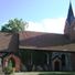 El edificio de la iglesia presenta muros de ladrillo rojo y piedras de campo, con una torre neogótica y un techo a dos aguas cubierto de tejas rojas.