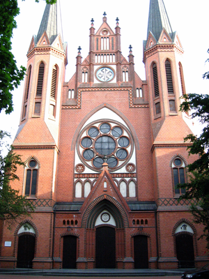 La iglesia de San Pablo presenta torres gemelas construidas en ladrillo, con elementos del neogótico como arcos puntiagudos y bóvedas con nervaduras.