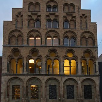 La casa Overstolzen es un edificio residencial románico de seis plantas con muros de piedra gruesos en Altstadt-Süd. La fachada muestra aberturas con arcos redondeados y un frontón escalonado típico de la arquitectura del siglo XIII.