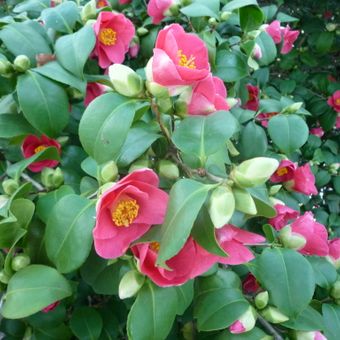 El árbol de camelia alcanza 8.94 metros de altura con una corona de 12 metros, produciendo miles de flores carmesí de febrero a abril.