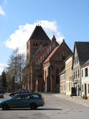 St. Marien es una iglesia de salón de tres naves construida en ladrillo rojo con tres tramos, cuya torre maciza se destaca sobre el paisaje urbano circundante. La estructura muestra características típicas del Gótico de Ladrillo con proporciones funcionales y líneas arquitectónicas claras.