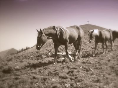 La cima de la montaña presenta una cruz tradicional bávara, reflejando la costumbre regional de colocar símbolos religiosos en puntos elevados.