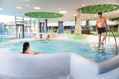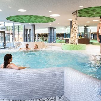 Los visitantes tienen acceso a ocho saunas diferentes, múltiples áreas de natación, tratamientos de bienestar y una sección infantil con toboganes acuáticos.