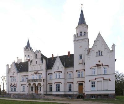 Schloss Kartlow es una mansión señorial en Kruckow construida con muros altos, arcos apuntados y detalles ornamentales del siglo 19. El edificio muestra características típicas del estilo Renacimiento Gótico con torres y elementos decorativos cuidadosamente diseñados.