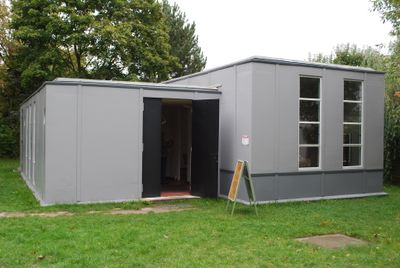 El edificio incorpora Torfoleum, un material aislante fabricado con turba, entre su capa interior de bloques de escoria enlucidos y el exterior de acero de tres milímetros.