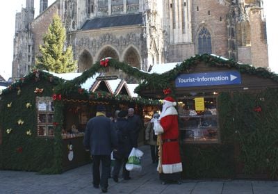 El Mercado Navideño de Ulm es un mercado de temporada en la Plaza del Münster con alrededor de cien puestos de madera que venden artesanías, juguetes, comidas regionales y decoraciones navideñas. Los puestos rodean la plaza principal, con vistas a la catedral del Münster detrás de ellos.