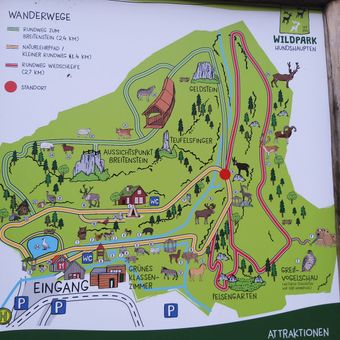 Tres senderos circulares atraviesan el terreno, ofreciendo a los visitantes diferentes perspectivas del valle Hüllergraben y sus formaciones rocosas como Teufelsturm.